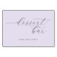 Ce panneau de table de mariage élégant présente un design minimaliste avec un fond lavande doux et une typographie cursive noire qui indique "bar à desserts". La police sans-serif simple et propre ci-dessous invite les invités à se régaler avec la phrase "PRENEZ UNE FRITURE !". La disposition équilibrée met en valeur la sophistication et l'accessibilité, ce qui la rend parfaite pour créer une atmosphère accueillante lors de votre événement. Son minimalisme moderne assure qu'il complète n'importe quel décor tout en maintenant un ton doux et invitant.