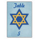 Une élégante carte de table qui est une d'une sorte, ce design dispose d'un arrière - plan bleu avec votre numéro de table écrit en bleu. Au centre se trouve une représentation bleue et or de l'Etoile de David. Commandez dès aujourd'hui ! Arrière - plan bleu : Michel Müller Star of David : Sonya DeHart Design http://www.sonyadehartdesign.com | http://www.sonyadehartdesign.etsy.com