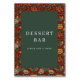 This wedding tabletop sign features a sophisticated design with a central dark green panel framed by an intricate floral pattern in warm shades of red, orange, and beige. The layout is symmetrical, creating a balanced and inviting atmosphere perfect for a celebratory occasion. Elegant serif typography highlights the "DESSERT BAR" text, encouraging guests to indulge in sweet treats. The combination of traditional motifs and modern aesthetics makes this sign a charming addition to any event, evoking feelings of joy and festivity.