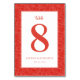Cette élégante carte de table de mariage présente un numéro "8" gras et de couleur corail centré sur un fond blanc impeccable, entouré de motifs complexes en forme de feuilles dans une teinte rouge assortie. Le design allie minimalisme moderne et sophistication subtile, utilisant des lignes nettes et des couleurs unies pour un look soigné. Une typographie script délicate ajoute une touche d'élégance au-dessus du chiffre, tandis que des polices sans-serif simples assurent la clarté des détails personnalisables en dessous. Parfaite pour ajouter une touche chic et contemporaine à votre réception de mariage, cette carte est conçue pour créer une atmosphère de luxe discret.