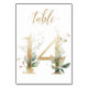 Élégante carte de numéro de table avec un motif botanique - une illustration aquarelle de feuilles vertes et dorées. Table 14. Veuillez vérifier tous les numéros disponibles