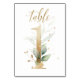 Belle carte de numéro de table avec un motif botanique - une illustration aquarelle de feuilles vertes et dorées. Table 1. Veuillez vérifier tous les numéros disponibles