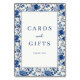 Ce panneau de table élégant pour mariage présente une bordure florale classique avec de grandes fleurs bleues et des feuilles vertes, créant un cadre sophistiqué autour de la zone centrale blanche. Le design comprend une typographie serif gras pour "Cartes et Cadeaux" et un "Merci" plus petit, ajoutant une touche formelle à la mise en page. Avec sa composition symétrique et sa palette de couleurs harmonieuse de bleus et de blancs, ce panneau exprime la gratitude dans un style intemporel, parfait pour améliorer la décoration de votre réception de mariage.