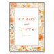 Ce panneau de table de mariage présente un charmant motif floral avec des couleurs pastel douces, notamment des nuances de pêche, d'orange clair, de crème et de vert atténué. Le design met en valeur des fleurs stylisées comme des marguerites et des roses, créant un thème botanique harmonieux et fantaisiste. Au centre, une typographie élégante affiche "Cartes et Cadeaux" dans une police serif raffinée, complétée par un "et" en cursive, tandis que "Merci" est écrit en dessous en petites lettres capitales. L'ambiance générale est chaleureuse et accueillante, ce qui en fait un élément idéal pour exprimer votre gratitude lors de votre événement spécial.