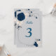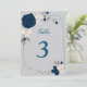 carte de numéro de table avec fleurs bleu marine et blanc sur un cadre géométrique
