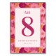 Cette carte de table de mariage présente un design floral vibrant avec de grandes fleurs stylisées dans des nuances de rose, de pêche et de bordeaux sur un rectangle central blanc. Le numéro "8" est visible en magenta gras, accompagné d'une écriture cursive élégante pour le mot "table". En dessous, les noms et la date sont présentés dans des polices serif classiques, créant un look équilibré et sophistiqué. La palette de couleurs chaudes et les motifs floraux ludiques évoquent une atmosphère joyeuse et romantique, parfaite pour célébrer des moments spéciaux lors de votre réception de mariage.