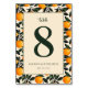 Cette carte de table de mariage présente un design ludique et élégant avec un rectangle beige central encadré par un motif vibrant de fruits orange et de feuilles vertes. Le numéro "8" gras et vert foncé se détache sur le fond doux, tandis que le motif d'agrumes environnant ajoute une touche fraîche et vive. Les lignes épurées et les couleurs plates lui donnent un aspect graphique moderne, parfait pour ajouter une ambiance joyeuse à votre événement. Les champs de texte personnalisables vous permettent de personnaliser chaque carte sans effort, ce qui la rend idéale pour les mariages ou les rassemblements formels.