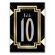Cette audacieuse et élégante carte de table de mariage numéro dix présente un thème Art déco des années 1920 vintage. Le design géométrique est en faux or noir, blanc et subtilement ombragé, avec un faux numéro de look de diamant dans une police d'époque déco.