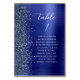 The left-hand edge of this elegant modern wedding table number card features a faux diamond glitter border. The word "table" and the table number appear in white handwriting script on a navy blue faux brushed metal background. Add the names of your guests who are assigned to each table.