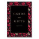 This wedding tabletop sign features a striking design with a central black square framed by a gold border, set against a vibrant background of deep red and dark floral patterns interspersed with skulls. The color palette includes rich tones of burgundy, maroon, and black, complemented by white flowers and green leaves, creating an edgy yet romantic aesthetic. The typography within the black square is elegant, using classic serif fonts for "Cards and Gifts" and a whimsical script for "and," conveying sophistication with a touch of boldness. Perfect for expressing gratitude at your wedding, this sign blends gothic and romantic themes to make a memorable impression.