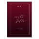 This elegant wedding tabletop sign features a deep maroon background with crisp white typography, creating a sophisticated and inviting atmosphere. The design includes a balanced layout with the phrases "cards and gifts" in flowing cursive script and "THANK YOU!" in a simple serif font, conveying gratitude and appreciation. Its minimalist style emphasizes elegance through simplicity, making it perfect for expressing thanks at your special event. Ideal for weddings or formal gatherings, this sign adds a polished touch to any celebration.