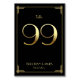 Cartes de numéro de table du mariage Great Gatsby Art Déco avec numéro d'or 99 et texte modifiable, où vous pouvez ajouter vos noms et date de mariage, imprimé sur arrière - plan noir