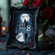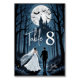 These elegant gothic table number cards depict a romantic scene of a couple walking through a mysterious forest toward an enchanting haunted castle. The design blends dark sophistication with a touch of fantasy, creating a refined and atmospheric look that perfectly complements a mysterious wedding theme.