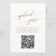 Ce numéro de table de mariage élégant en or imprimable 13x18 cm avec code QR photo est parfait pour un mariage simple. Le design neutre présente une carte minimaliste ornée d'une typographie romantique et fantaisiste en faux dorure. Personnalisez chaque numéro de table dont vous avez besoin et ajoutez chacun d'eux à votre panier individuellement.