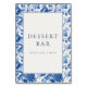 This elegant wedding tabletop sign features a classic blue floral pattern framing a central white space, creating a vintage wallpaper effect. The design showcases detailed roses and foliage in various shades of blue on a crisp white background, evoking a sense of timeless charm. Prominent serif typography announces "DESSERT BAR" with an inviting message below, encouraging guests to indulge. Perfect for adding a touch of sophistication and warmth to your event, this sign is ideal for guiding guests to the sweet treats awaiting them.