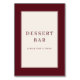 This elegant tabletop sign features a sophisticated design perfect for wedding celebrations. The minimalist layout showcases the words "DESSERT BAR" in classic typography, inviting guests to indulge in sweet treats. Set against a rich maroon border with a clean cream background, it exudes an air of timeless elegance and refinement. Ideal for adding a touch of class to your dessert table, this sign ensures your guests feel welcomed and pampered throughout the event.