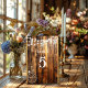 Arrière - plan rustique en bois de campagne avec lumières en bocal de mason accroché à des lampes à cordes, vieux wagon en bois cool avec boucle arc et vieille bordure de corde occidentale.
