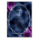 Cette élégante carte de numéro de table mariage moderne présente un cadre géométrique argenté décoré de bouquets de prune violet et argenté sur un arrière - plan bleu marine en faux feuille. Le texte personnalisable combine écriture fantaisie gris argenté, cuivre et polices italiques.