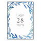 Cartes de numéro de table de mariage à feuillage bleu marine et blanc conçues pour être personnalisées rapidement et facilement selon les spécificités de votre événement.