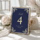 Elégante carte de numéro de table baroque bleu marine et or, parfaite pour guider les clients vers leur siège à la réception. Conçu avec des fleurs dorées ornées et des détails personnalisables, ce numéro de table est idéal pour les mariages classiques, de luxe et classiques. Coordonné avec la suite de faire-part de mariage baroques bleu marine et or pour un look cohésif.