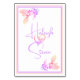 Il s'agit d'un design floral dans les tons rose vif et violet sur une carte de table blanche qui convient aux mariages ou autres fêtes. Un côté a les noms des mariés et des mariés avec des oeuvres d'art, tandis que l'inverse a le numéro de table.