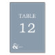 Un numéro de table de mariage moderne et unique incluant le nom de la mariée et du marié en bleu poussiéreux. Personnalisez votre propre mariage Dusty Blue avec ce design et cette couleur dans notre collection.