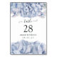 Cartes de numéro de table mariage des hydrangées bleues. Vous y trouverez des dahlias, des chrysanthèmes et des roses.