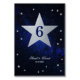 Un numéro de table de mariage pour un thème de mariage céleste, avec des étoiles argentées sur un fond de ciel nocturne bleu foncé.
