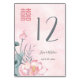 Cette carte de numéro de table chinoise contemporaine comporte une fleur de lotus peinte à l'aquarelle et un symbole double xi rose sur un arrière - plan d'aquarelle rose.