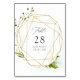 Cartes de numéro de table de mariage avec feuillage tendance et cadre géométrique doré conçues pour être personnalisées rapidement et facilement selon les spécificités de votre événement.
