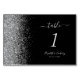 Le bord gauche de ce numéro de table mariage moderne élégant présente un faux design de parties scintillant argenté. Le texte personnalisable combine écriture gris argent, copperplate et polices italiques sur un arrière - plan noir.