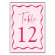 Ajoutez une touche de style à votre célébration mariage avec ces cartes de table mariage Modern Wavy Frame ! Le design rétro affiche "Table" dans un script rose manuscrit avec le numéro de tableau ci-dessous. Une bordure ondulée rose foncé entoure le numéro de table, en contraste avec un arrière - plan rose pâle. Le dessin se répète à l'arrière. Pour commander les cartes de table : Ajoutez chaque numéro à votre panier individuellement et retirez-le lorsque vous avez terminé. Ne commandez pas par quantité ou vous recevrez des multiples du même numéro.