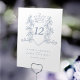 Blanc avec cime argentée dessinant le numéro de la table d'art. Modifiez ce numéro de table mariage avec vos noms de couple et la date du mariage. Les cartes de table doivent être ajoutées à votre panier une à la fois, des rabais peuvent s'appliquer à plusieurs cartes. Design original et crête avec couronne cardiaque, entrelacé de feuilles et de baies dessinés à la main par Sarah Trett pour www.mylittleedenweddings.com exclusivement sur Zazzle.