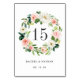 Elégante carte de numéro de table de mariage avec une couronne de fleurs d'aquarelle rose et blanc avec feuillage vert et feuille. Pour une personnalisation plus avancée de cette conception, veuillez cliquer sur le bouton "Personnaliser". Des articles correspondants sont également disponibles.