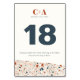 Un détail en pierre de terrazzo tendance et une typographie d'inspiration du milieu du siècle donnent à ce numéro de table mariage une ambiance chaleureuse et moderne dans une palette de couleurs inspirées du désert de rouille, de rouille et de bleu ardoise, le tout complété par un monogramme moderne.