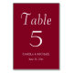 Guidez vos invités de mariage à leur table avec cette carte de numéro de table de style simple qui comporte des lettres blanches stylisées sur un arrière - plan de couleur rouge canneberge tendance. Le design est de chaque côté de la carte. Modifiez votre carte pour modifier le numéro de table, le nom du couple de mariages et la date. Commandez les cartes séparément pour chaque numéro de table.