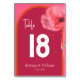 Ce design est composé d'une carte de table de mariage d'été aux couleurs vives, rose et orange, avec des polices de caractères élégantes pour le nom du couple, et d'une police propre pour les détails.