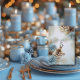 Numéro de table de mariage d'hiver avec de beaux cônes de pin marron, blanc et bleu, branches de pin et accents dorés. Personnalisez le texte et la police à votre goût. #contenugénéré