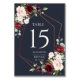Moderne et tendance, cette carte mariage de numéro de table présente une géométrie en faux cuivre agrémentée d'une aquarelle de verdure eucalyptus et d'arrangements floraux bordeaux et roses, sur une texture bleu marine moderne. Tout le texte est dans des couleurs rose pâle et blanc assorties, et le design est le même des deux côtés. Copyright Invitations élégants. Tous droits réservés.