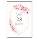 Cartes de numéro de table de mariage floral aquarelle rose avec fleur de sakura et cadre géométrique doré personnalisable selon les spécificités de votre événement.