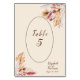 Belles fleurs séchées, herbe de pampa, feuilles de palmier, blé, feuilles et baies séchées carte de numéro de table.