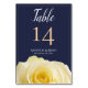 Roses Jaunes Bleues Modernes Mariage Floral Numéro de tableau. La carte est moderne et élégante en bleu foncé avec une belle rose jaune et une fine bordure. Le texte est en blanc et couleur pêche. Customisez chaque carte séparément pour chaque numéro de table et mettez-la séparément dans votre panier. Personnalisez tout le texte de la carte de table. Vous pouvez trouver les articles correspondants ci-dessous dans Collection Mariage bleu nuit rose jaune.