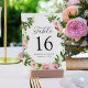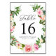 Cartes de numéro de table élégantes et fleuries, mariage, avec une couronne de fleurs rose aquarelle et rougies aux feuilles vert vif. Personnalisez les cartes de numéro de table rose fleurie en ajoutant le numéro de table, vos noms et votre date de mariage. Le dessin se répète à l'arrière. Conçu pour coordonner avec notre collection de mariages floraux rose pâle.