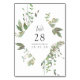 Cartes de numéro de table de mariage avec verdure inspirée de l'organique et cadre géométrique conçues pour être personnalisées rapidement et facilement selon les spécificités de votre événement.