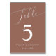 Numéro de table de mariage minimal et élégant avec texte de script moderne qui dit "Table" en haut sur un arrière - plan en terre cuite.