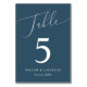 Numéro de table de mariage minimal et élégant avec texte de script moderne qui dit "Table" en haut sur un arrière - plan turquoise.