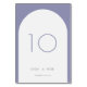 Numéro de table minimaliste simple mariage avec une arche blanche sur un arrière - plan violet. Idéal pour les mariages pourpres minimes. Conçu par Patricia Alvarez.
