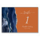 Le bord gauche de cette élégante carte de numéro de table mariage moderne comporte une bordure marine d'aquarelle bleu ornée d'une parties scintillant en faux argent. Le texte personnalisable combine écriture gris argent, italique et polices de cuivre sur un arrière - plan orange brûlé.