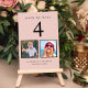 Numéros de table d'accueil de mariage rose vif et amusant. Chaque numéro de tableau correspond à des photos de la mariée et du marié à ce même âge (p. ex., pour le tableau 4, ajouter des photos de la mariée et du marié à l'âge de 4 ans). Si vous avez un grand nombre de tables, divisez-les en deux et faites la première moitié avec une couleur arrière - plan et la deuxième moitié avec une couleur arrière - plan différente. Par exemple, si vous avez 30 tables, vous pouvez avoir une carte de numéro de table blanche 1 -15, et une carte de numéro de table noire 1-15 (et indiquer la couleur de numéro de table appropriée sur les cartes de place).