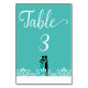Carte Turquoise bleu vert mariage Numéro de table pour votre faire-part spécial avec tourbillons blancs et illustration de mariée et de mariée par PLdesign. Vous pouvez customiser du texte, des images et une couleur turquoise bleu-vert.